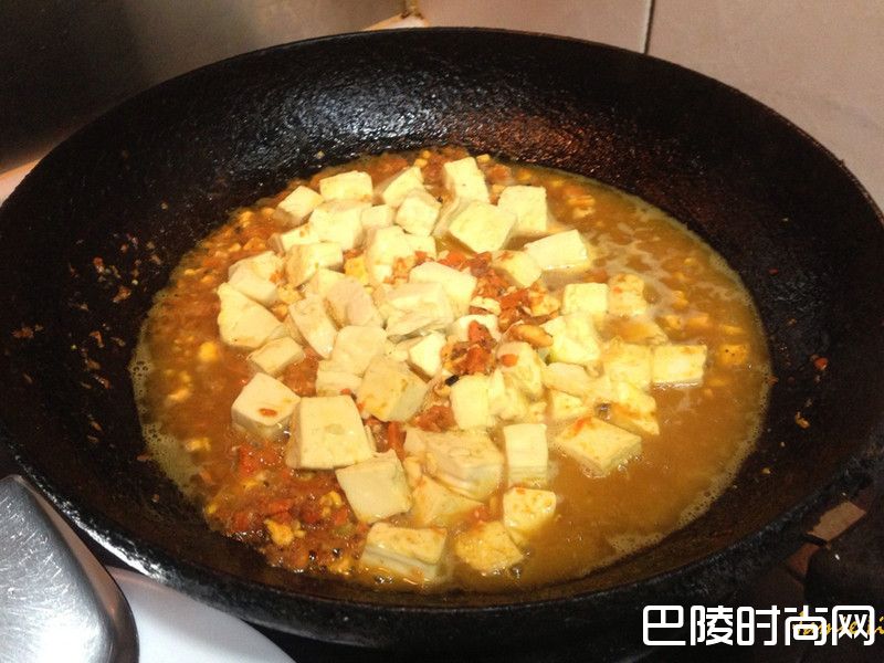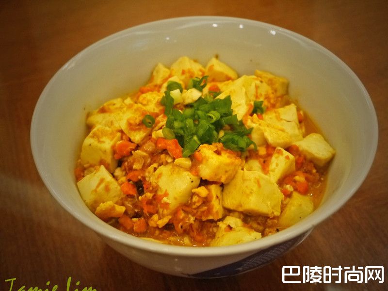 7加入蟹黄和蛋黄和先前的虾米红萝卜泥一起炒至上色均匀,再加一碗水与半碗米酒和一匙蠔油煮至水滚后加入豆腐,撒入先前准备的太白粉水,芶薄芡,再盖上锅盖闷个五分钟
