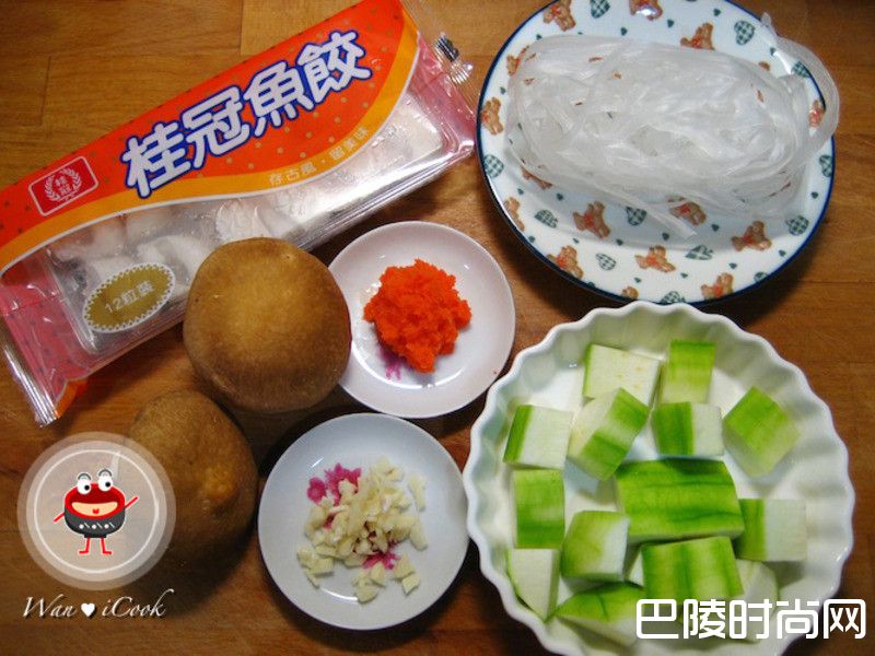 1备料:宽粉丝先泡水软化,香菇、丝瓜(去囊)洗净切块,蒜切末,红萝卜 用擦姜板磨成泥,备用。