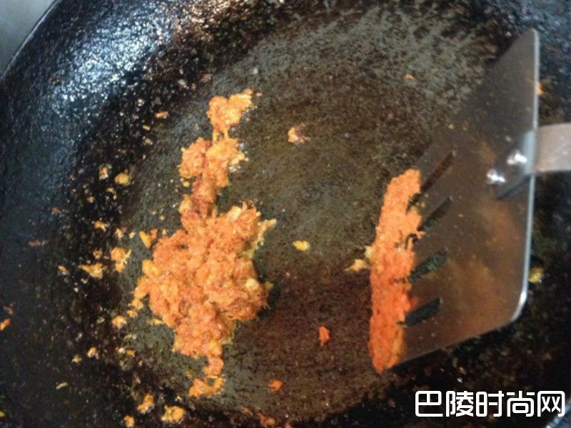 6重新起锅,加入些许香油,倒入1/4碗青葱和姜片爆香,待炒出香味以后把姜片和青葱取出只留下油的部分再加一点油,置入红萝卜泥炒香再加入虾米碎拌炒至油略呈现橘红色,虾米炒香
