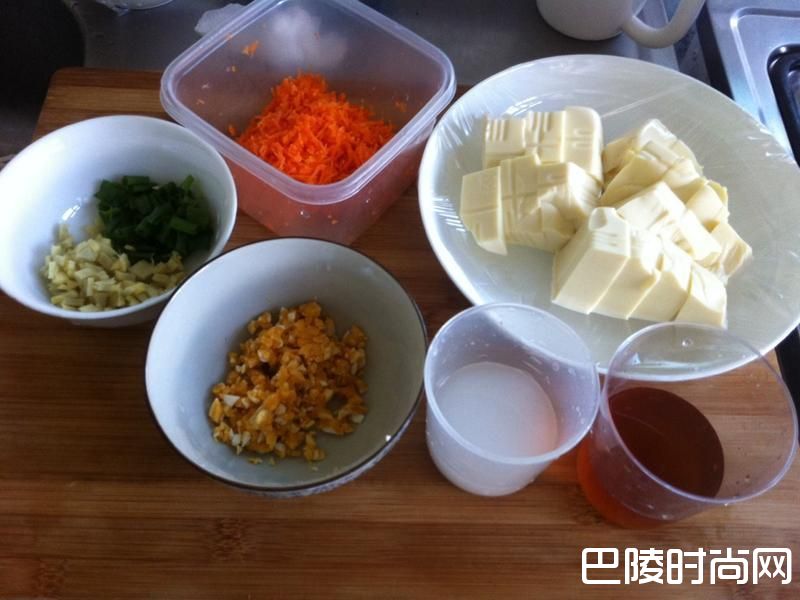 1备料:葫萝卜刨泥/豆腐切块/葱切花/姜切末/咸蛋黄压碎/调好太白粉水、调味料水。