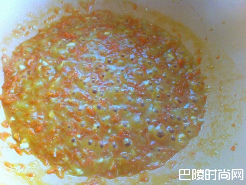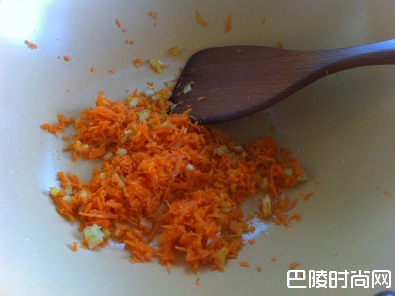 3同一个油锅,下姜末与胡萝卜泥拌炒。
