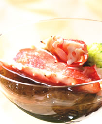 鳕场蟹水云醋鳕场蟹1只,青花菜1朵,无味柴鱼汤500c.c.,水云醋:适量,柴鱼汤1000c.c,味醂100c.c,浓口酱油100c.c,淡口酱油200c.c,烧过的清酒100c.c,白醋300c.c,糖1/2大匙,盐3小匙