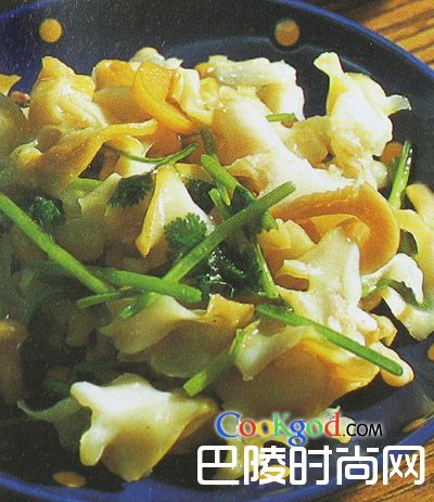 炒海螺片鲜海螺750克,香菜段50克。调料油2大匙,绍酒、花椒水各1大匙,精盐、味精各1/3小勺,葱姜丝少许,淀粉适量。