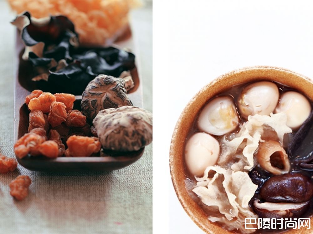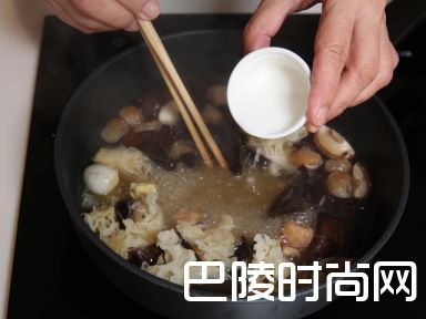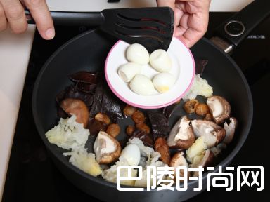 3在大油镬中加入鸡汤,黑木耳,白木耳,香菇,龙眼干和鹌鹑蛋