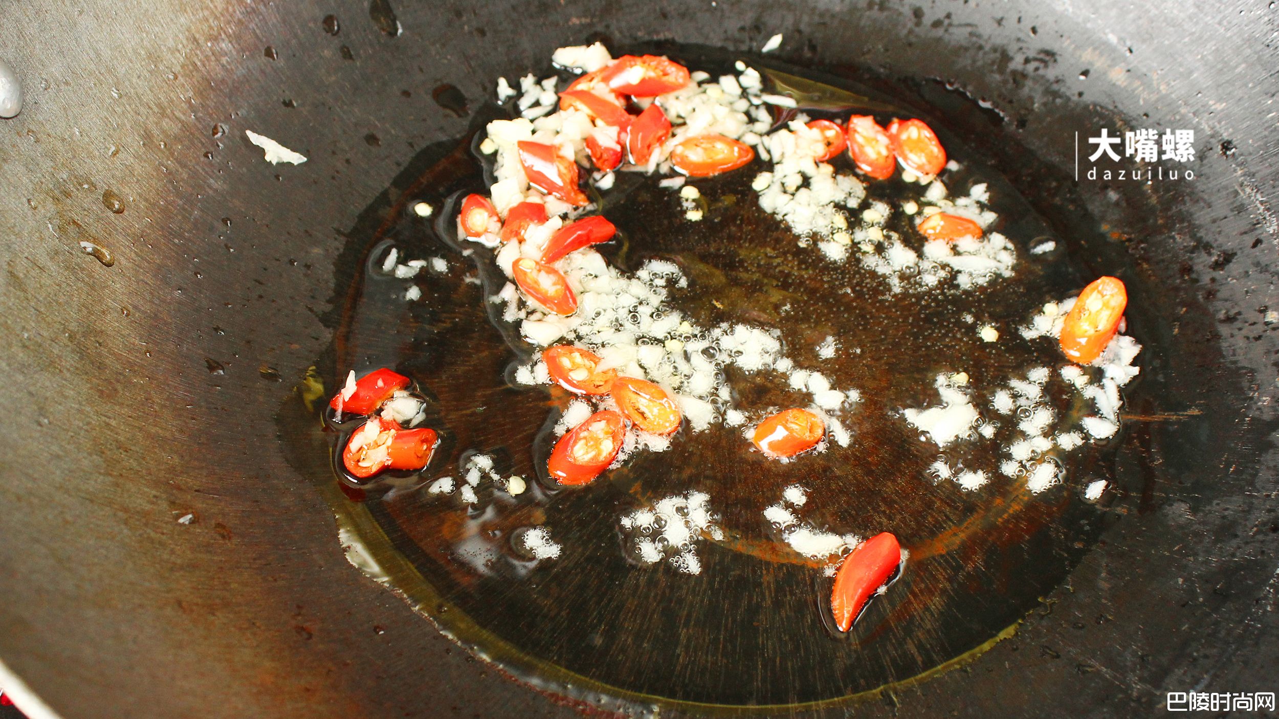 4热油锅,7分热时放入蒜末红尖椒,翻炒出香味