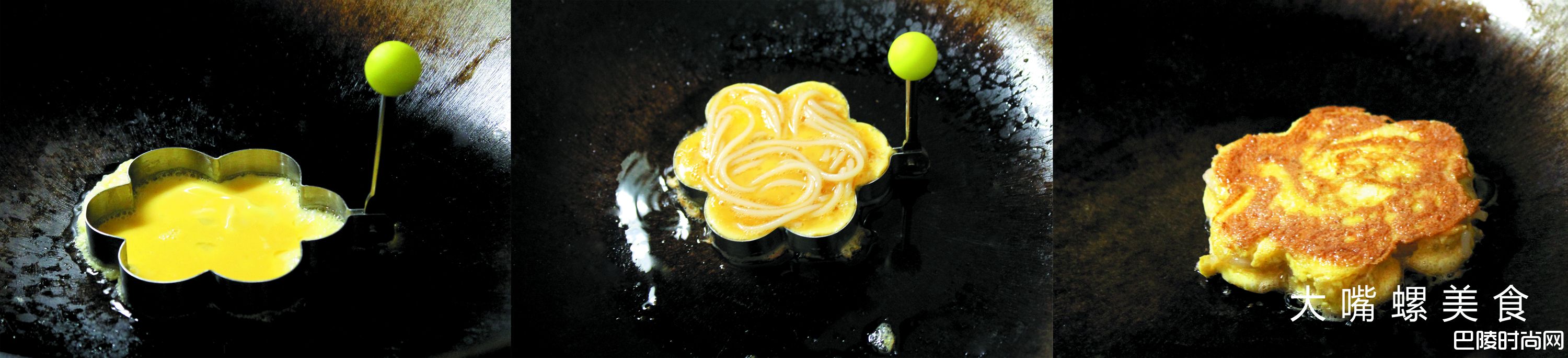 5锅内放入模具,油,烧至六成热时在模具内倒入少量搅拌的鸡蛋液。放入之前备好的螺蛳粉,接着再倒入少量鸡蛋液。小中火,煎至底部金黄,拿出模具,翻面,煎至双面金黄,出锅备用