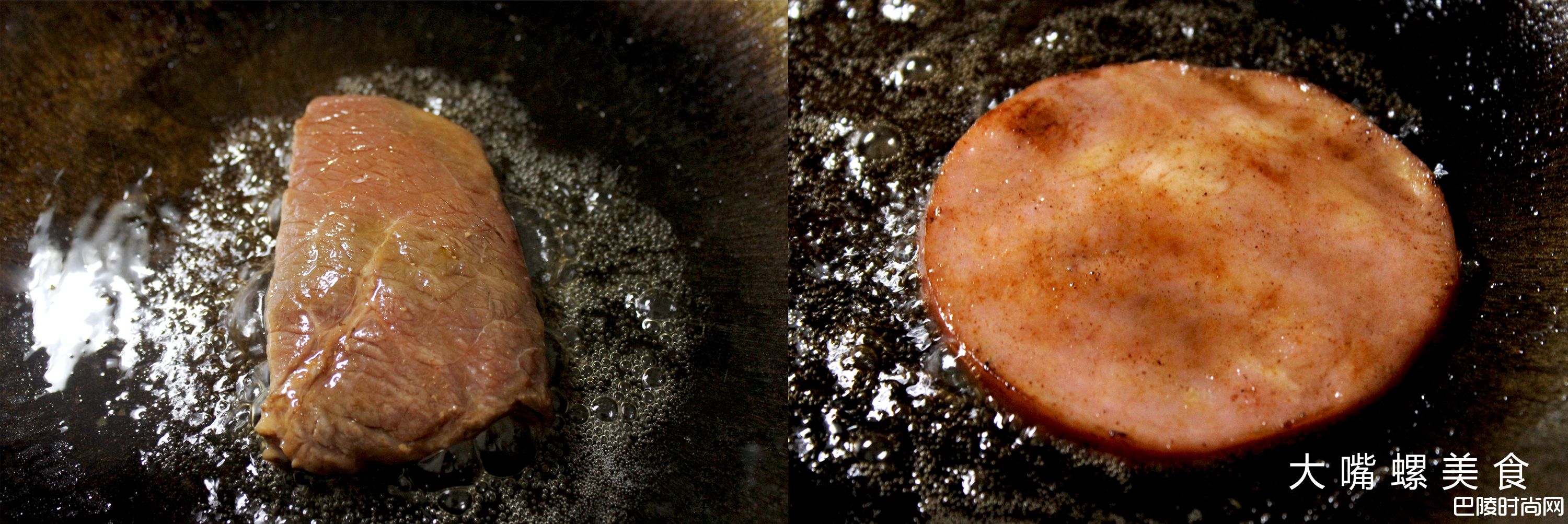 1首先,准备好新鲜牛排肉,猪排肉,火腿片