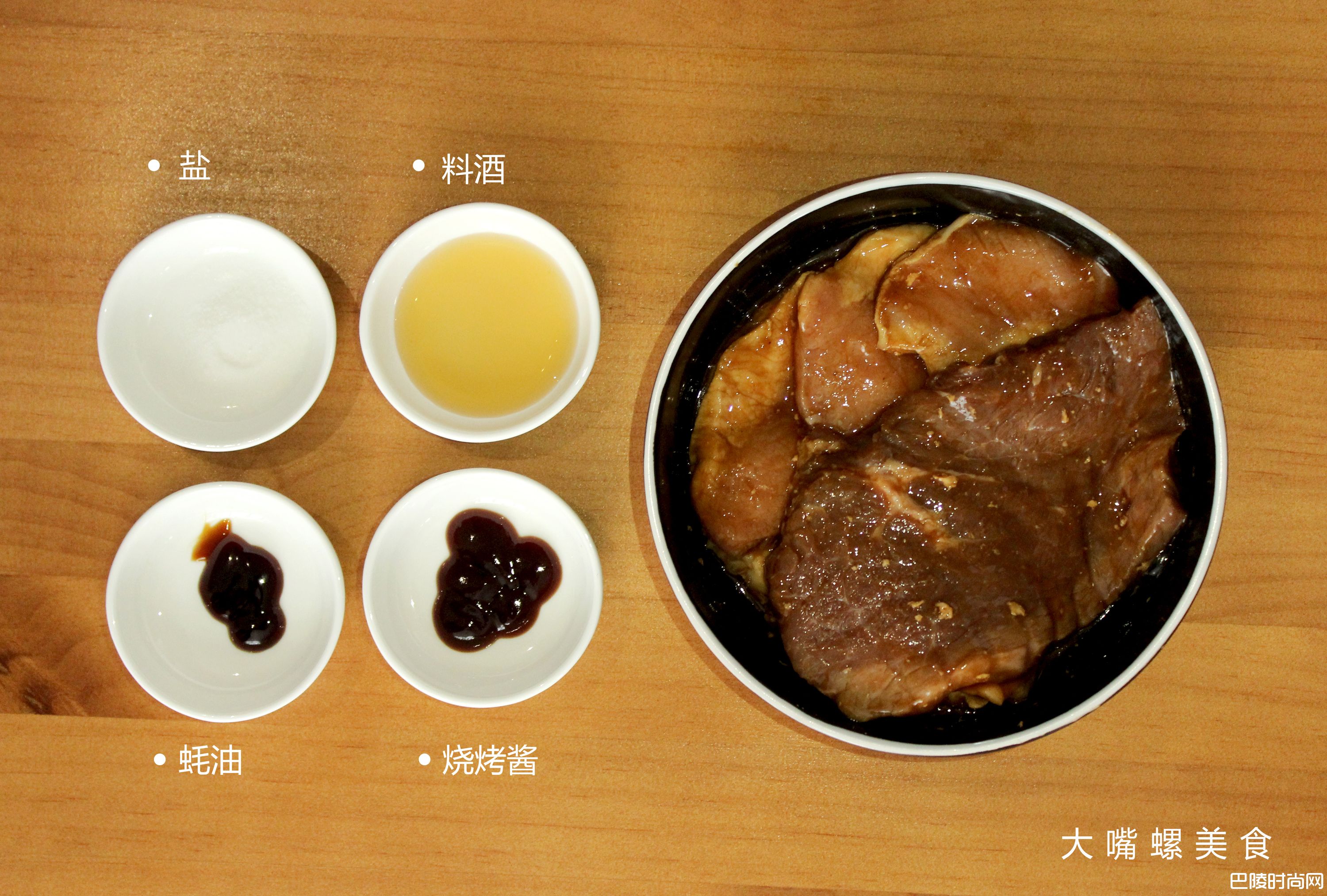3牛排肉/猪排肉,加入盐,料酒,蚝油,烧烤酱腌制十五分钟以上,备用