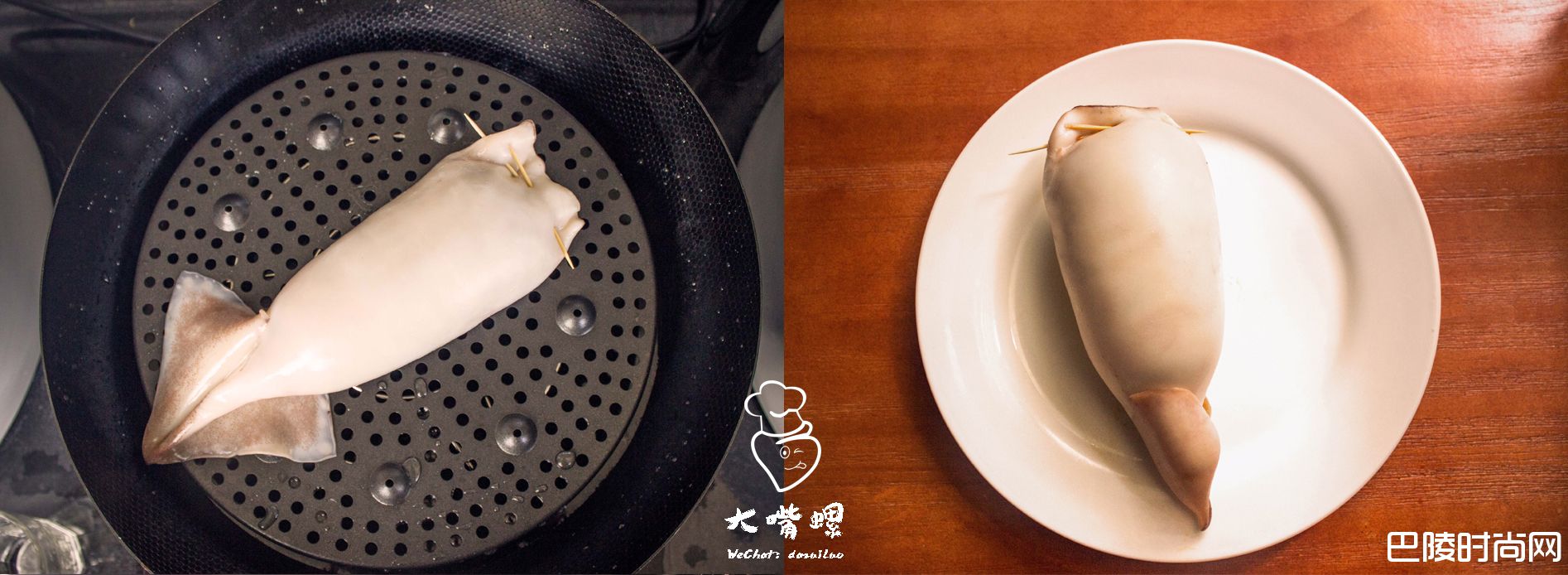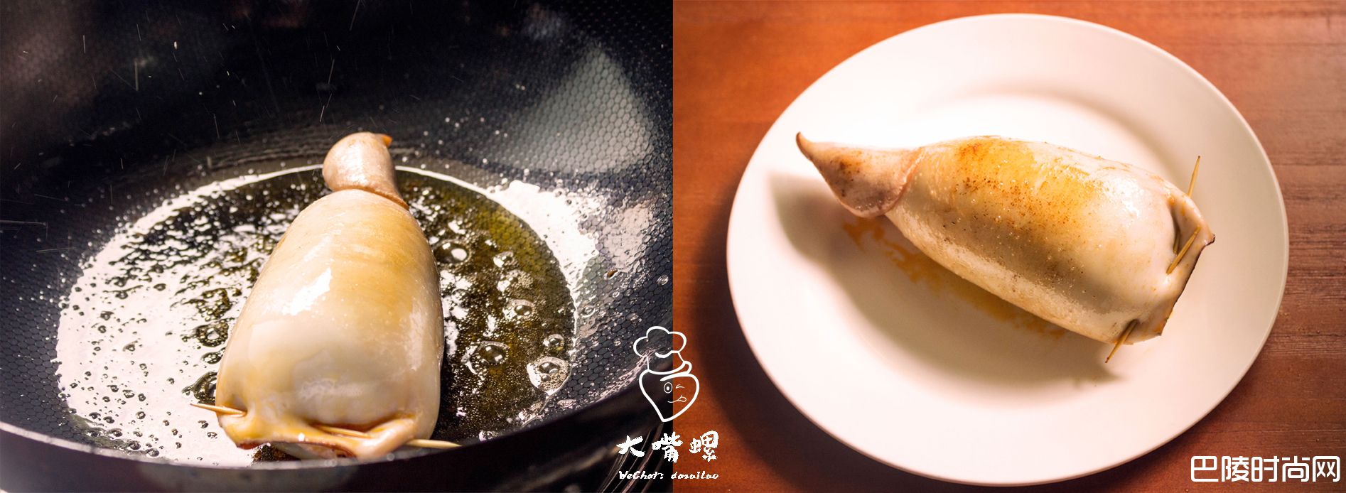 6用牙签刺穿鱿鱼口,呈s型缝好。(鱿鱼很滑,注意别刺到手)