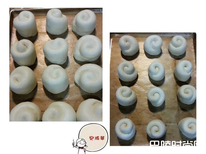 6将切开面朝下排放在烤盘上,间隔排列,以免后发黏在一起。表面喷水入烤箱后发60分成两倍大。