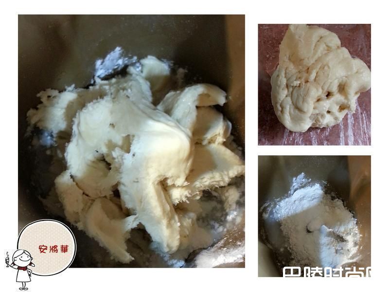 依水、糖、高粉,中种拨片加入,按下开关揉打3分加入盐,续打至剩下8分时加入奶油打至光滑即可,打好面团基发20分。