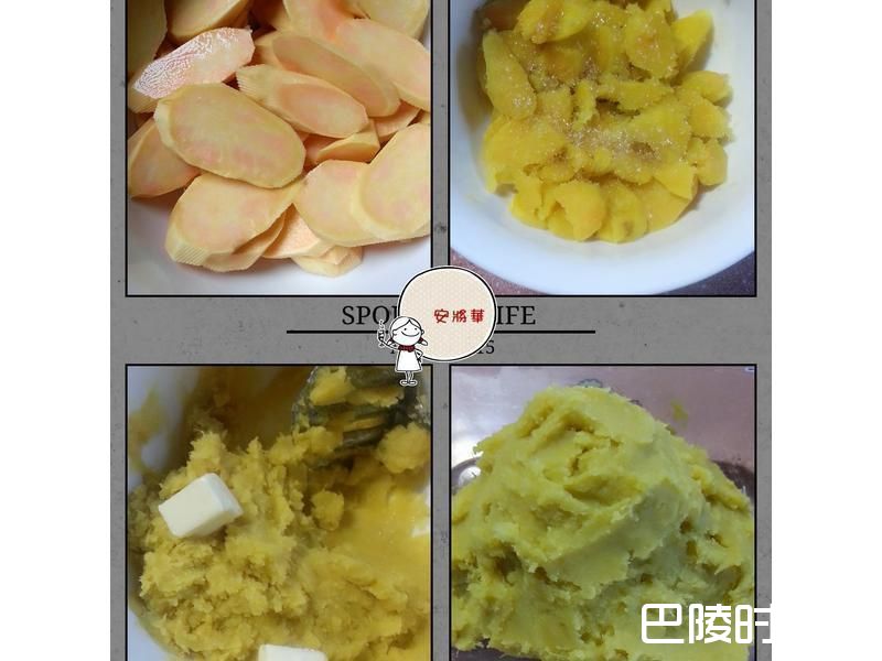 2将地瓜削皮切薄片,用蒸笼蒸熟蒸烂,取出趁热加适量二砂糖拌匀,加些奶油提香,拌匀放凉备用。
