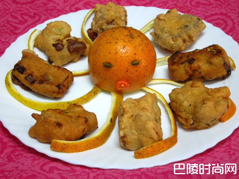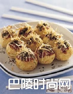 (5)将章鱼烧适量涂上美乃滋与山葵酱,并洒上柴鱼丝及海苔粉即可食用。