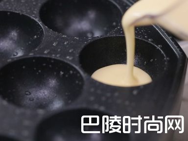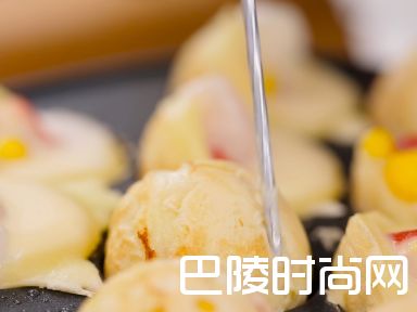 4用竹签翻动丸子,在空缺的地方继续倒面糊。继续用竹签翻动至圆形。