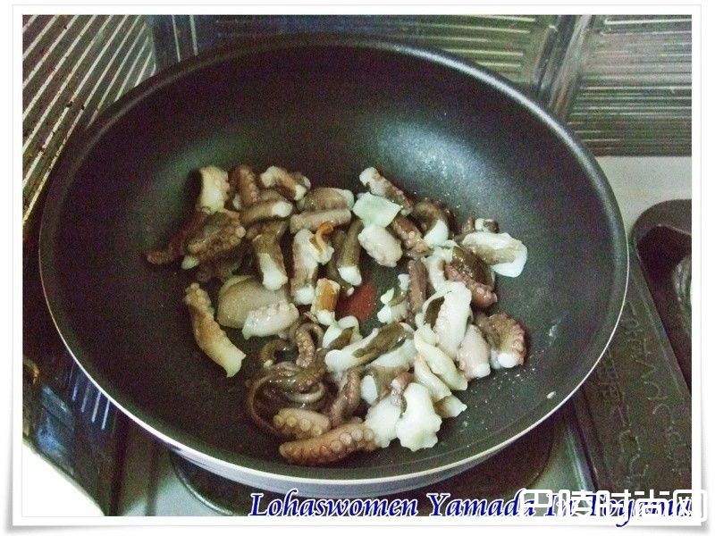 2起油锅,放生章鱼下去炒,如果章鱼出太多水先关火把水倒掉,我是没有遇到这种情形。