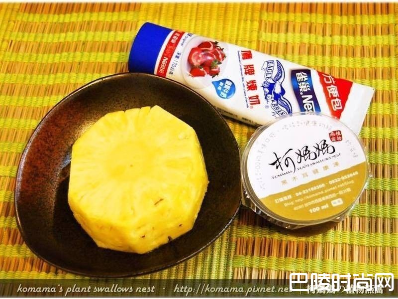 1准备新鲜凤梨、黑木耳健康冻与炼乳等相关料理食材。
