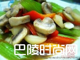 西芹炒蘑菇蘑菇250克,西芹250克,红椒1个,马蹄适量,姜适量,蒜适量,盐适量,鸡精适量