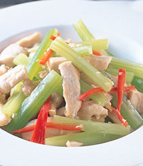 2.将蒜以2大匙油爆香,放入鸡肉炒至8分熟后再加入西芹、辣椒、调味料略炒,起锅前淋上香油即可。
