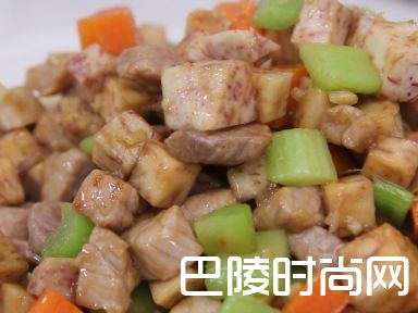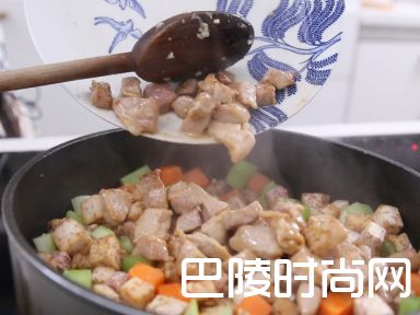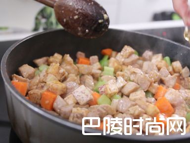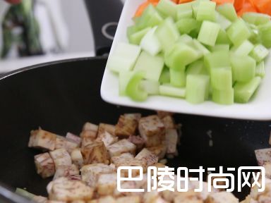 7加入西芹粒、红萝卜粒炒至软腍