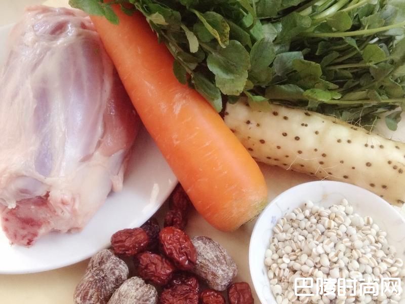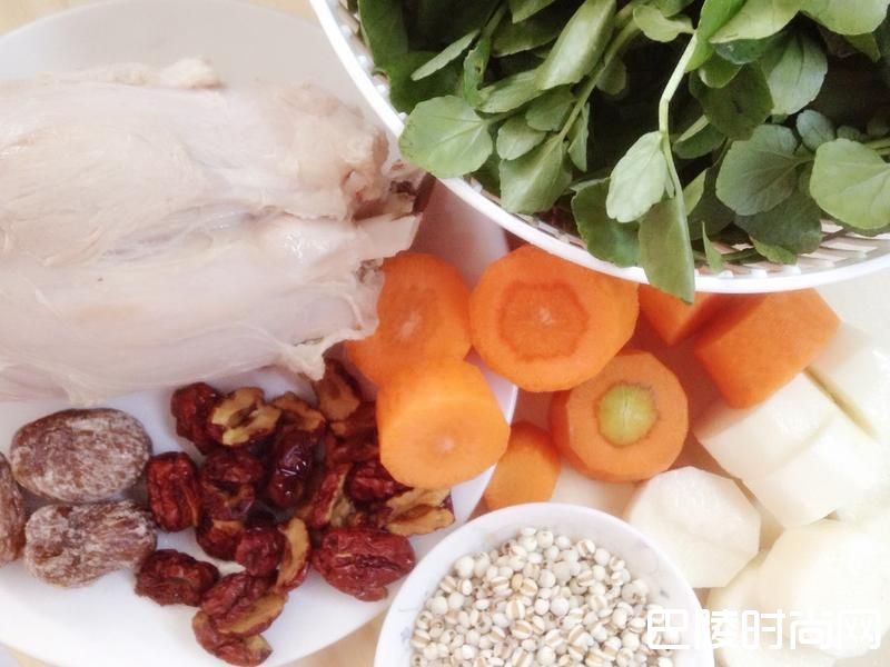 2整理食材。清洗西洋菜/川烫猪腱骨去血水/红萝卜和山药去皮切块/红枣去核后和薏仁用热水烫洗过。