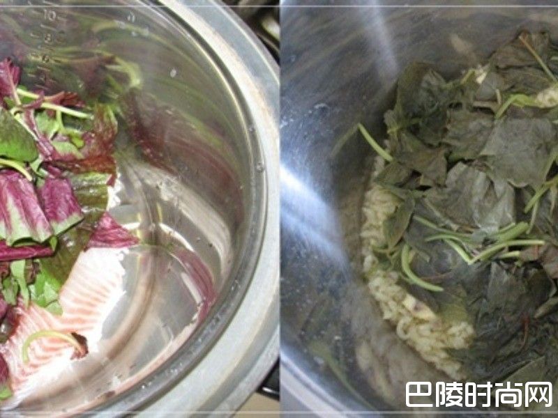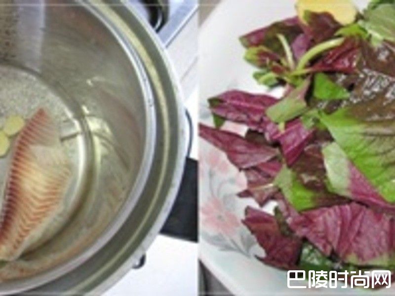 1米:水=1:7 (七倍粥),加入鲷鱼跟姜片,红苋菜取嫩叶嫩茎部分