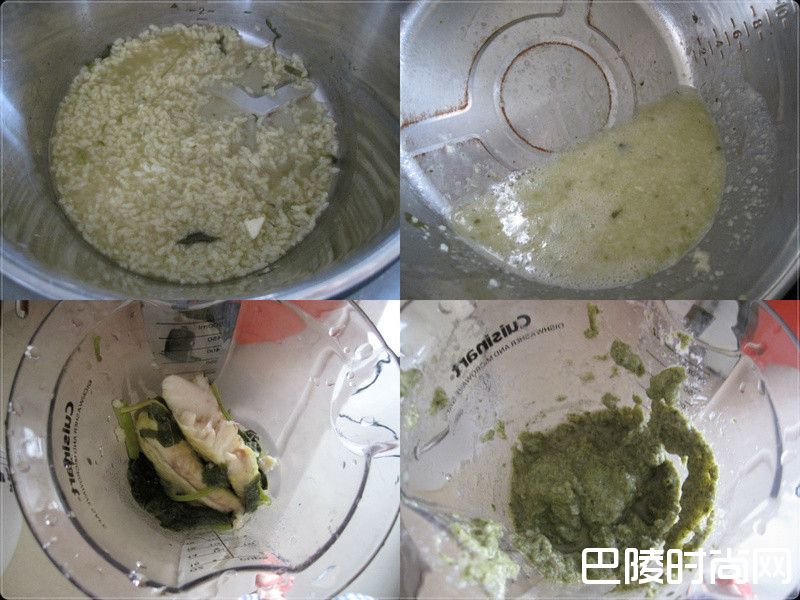 3蒸好后把鱼肉跟叶菜挑出来打泥,粥则用汤匙压细碎但保留米粒口感,让宝宝可以练习咀嚼