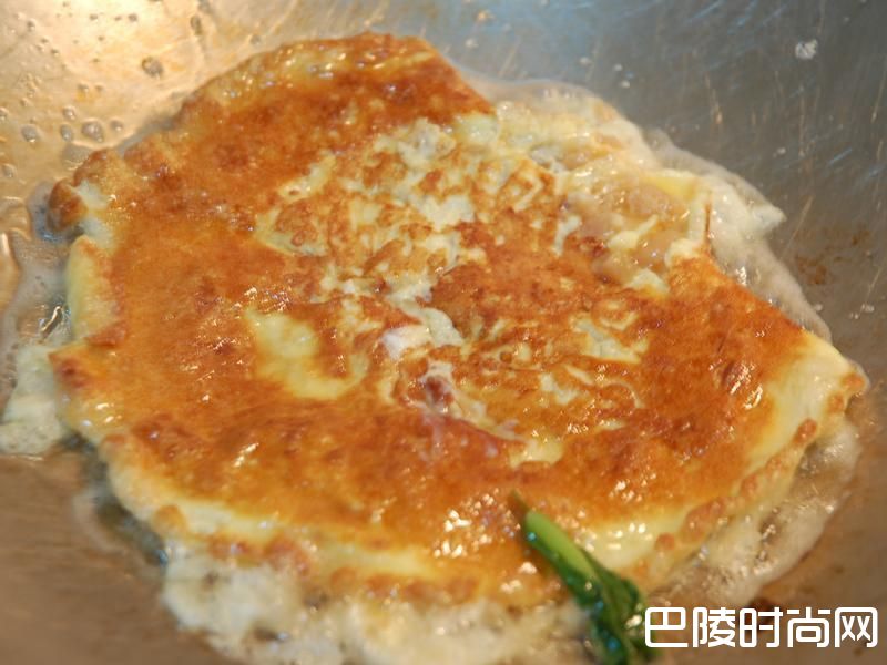 5菜脯加入打入空气的蛋液,倒入热油锅中,待一面熟了再翻面