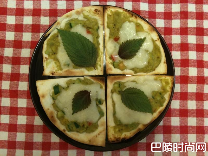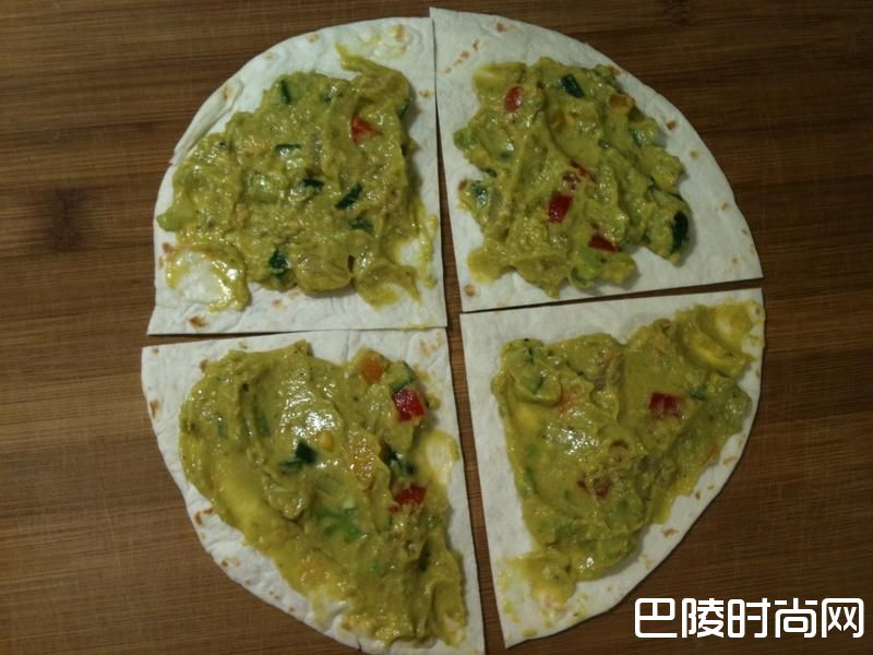 1将墨西哥薄饼皮切成四等份(因为苹果姊姊的烤箱是一般家用小烤箱,所以要先切饼皮,这样子烤箱才放得下。如果您家的烤箱是大烤箱的话,就可省略这个步骤囉)后,在墨西哥薄饼皮上涂上蔬果酪梨抹酱。