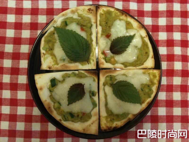 放入烤箱烘烤3分钟。烤好后,舖上新鲜紫苏,吃披萨囉。