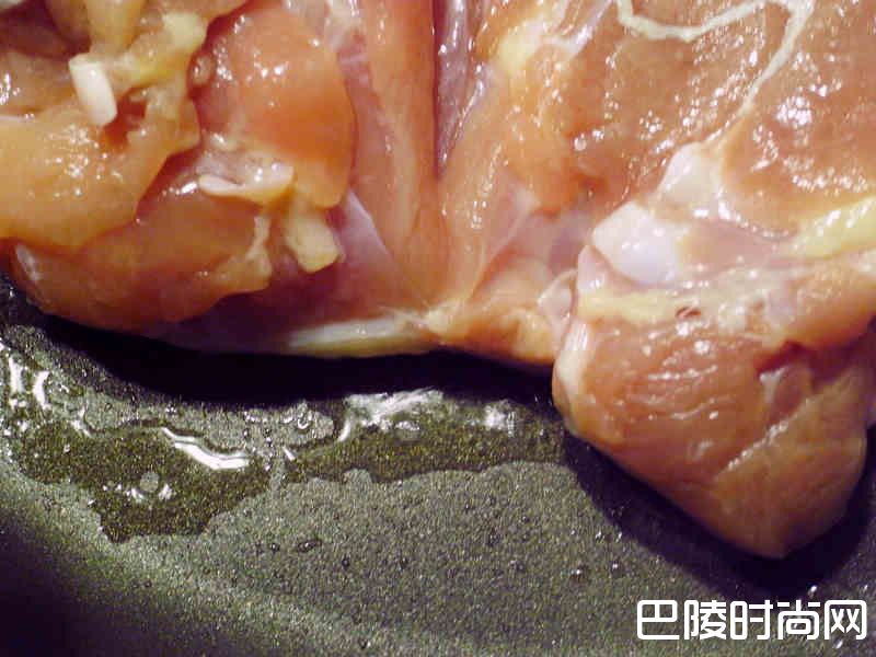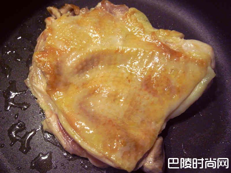 4热好锅后将整片的腿肉放下去干煎,要先煎有皮的那面唷(用意:逼出鸡腿肉的油)