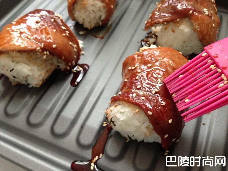 5用醃制好的肉片卷起饭团,要稍微卷紧一些