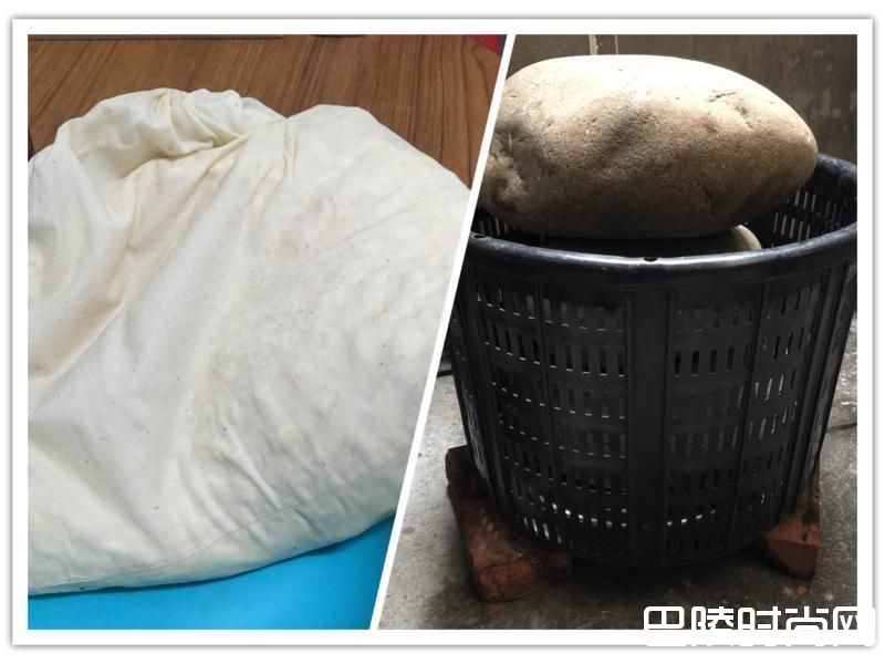 4【去苦水】隔日将萝卜捞起沥干、用布袋装好绑紧,换成盆底或篮底有洞的容器并垫高,以重物再压一天一夜,使盐水能压出并流出容器外(其间需翻动2-3次并扭紧布袋,让所有萝卜切片皆能均匀受压),除去苦水后备用。