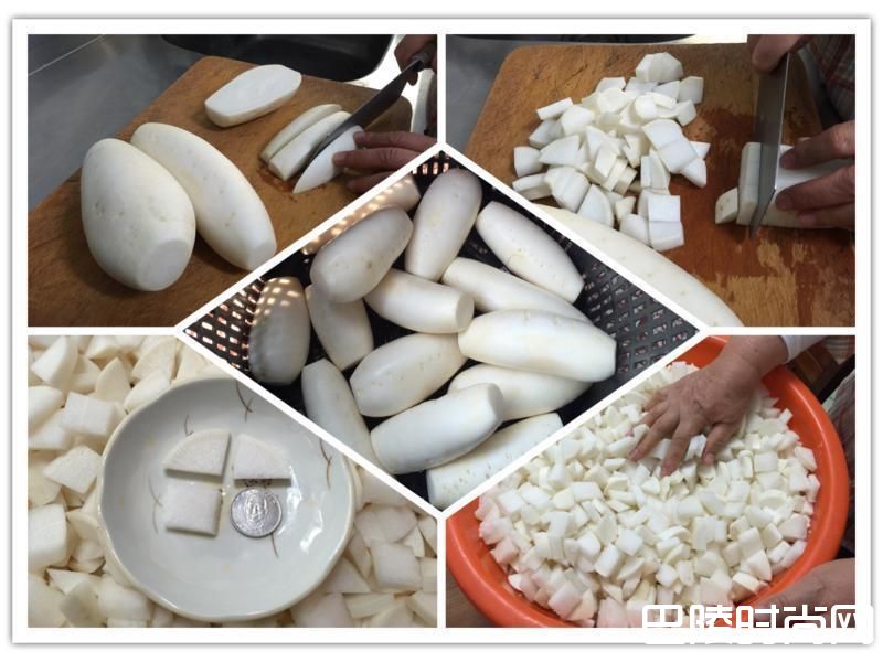 2【洗净切片】将10斤萝卜洗净、阴干(表面不可有水分),连皮切成小块薄片(约10元硬币大小,厚度约0.5cm),再加入半斤盐用手翻搅均匀。