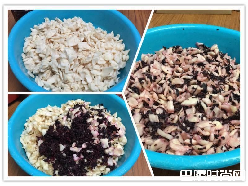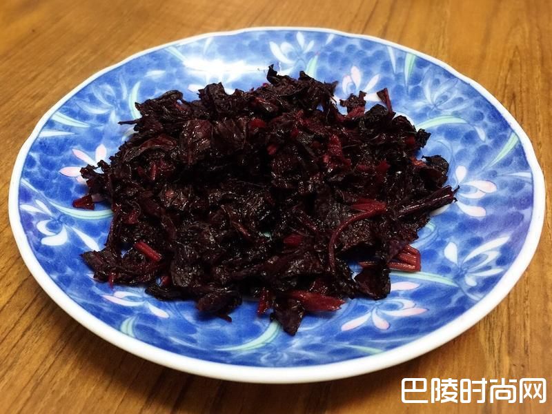 6【醃料】将晾干的紫苏切细,加入2大匙白醋、1大匙糖及1小匙盐醃制一天一夜,使紫苏颜色更透红。