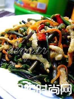 蕨菜炒肉丝蕨菜,猪里脊,胡萝卜,干辣椒,调料:盐,料酒,糖,生抽,味精