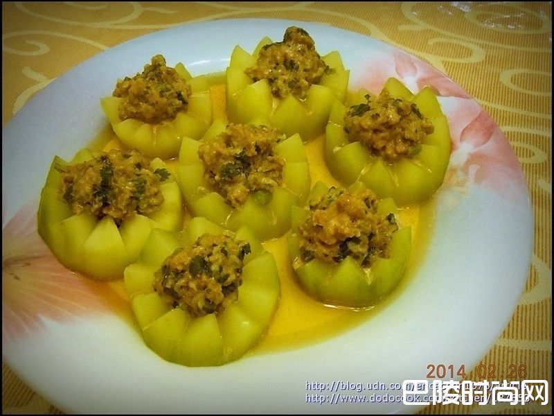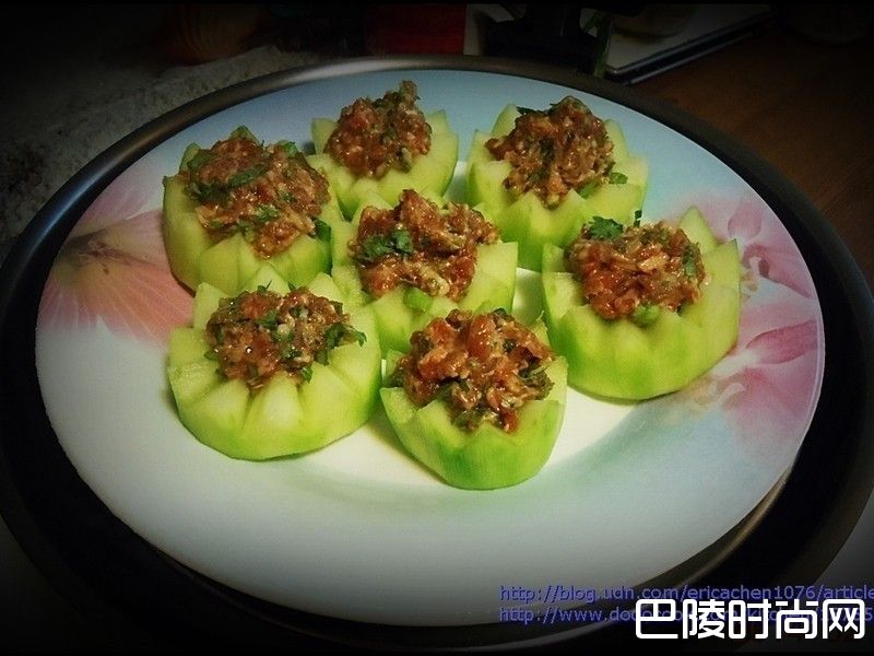再加入太白粉,拌好相在挖空的大黄瓜上,放入蒸锅蒸十七分钟,取出盛盘上桌。