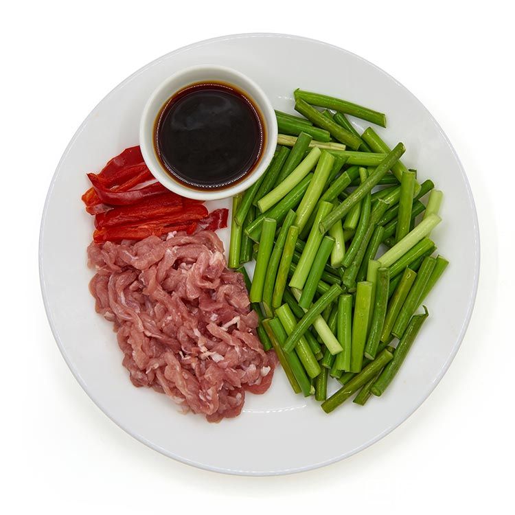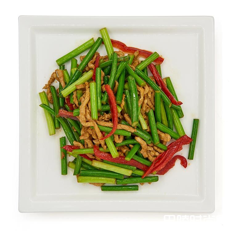 蒜苔炒肉丝后腿精肉丝100g,蒜苔段150g,大红椒丝20g,小炒料包30g
