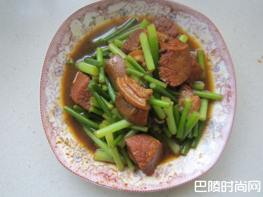 4、五花肉9成熟时放蒜苔焖煮5分钟,放盐和鸡精调味即可。