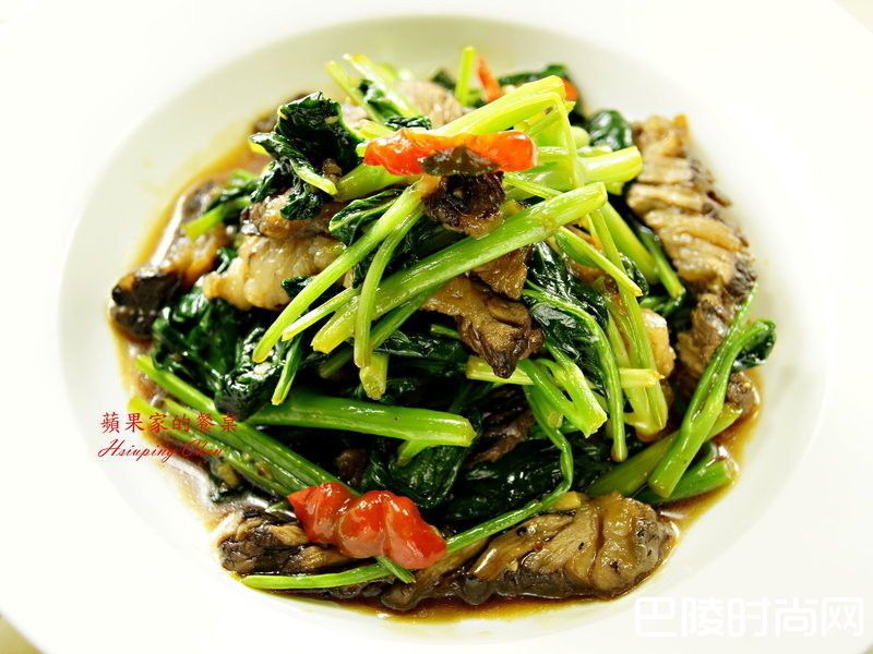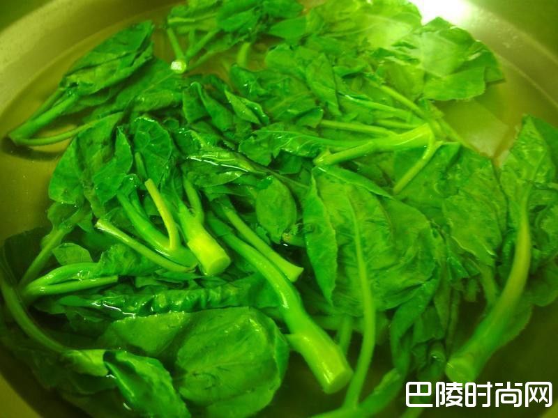 4芥蓝菜洗净~煮一锅水~水中加一匙的油和一小匙的盐烫熟~起沥干水份铺在盘中~