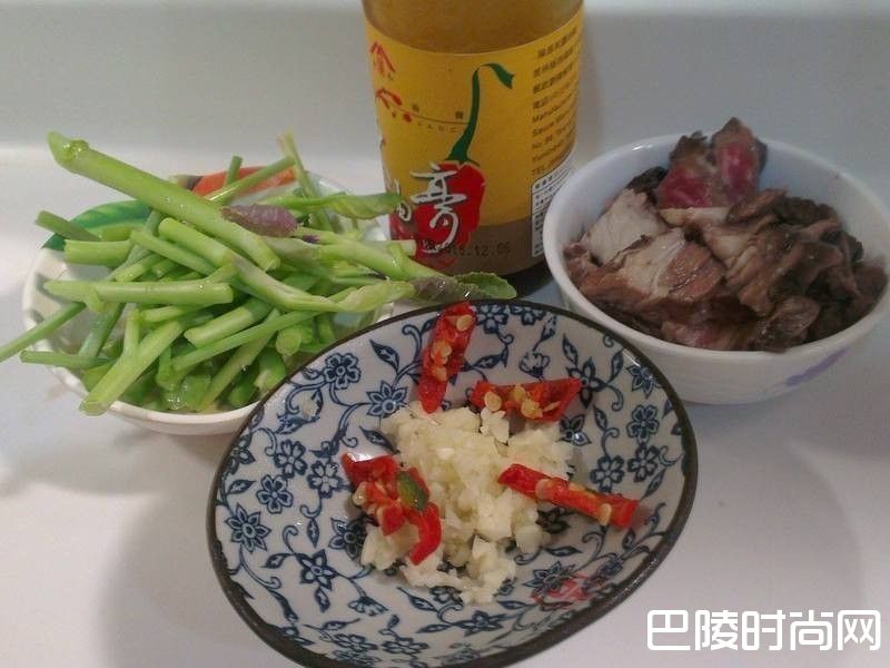 1主要食材:鲜将牛肉切片放入容器加入所有的醃料放置冰箱静置10分钟以上。芥蓝洗净梗与叶子分开放,蒜末,辣椒切好备用