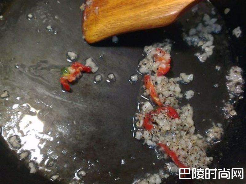 3同一锅再加入少许的油放入蒜末,辣椒末炒香