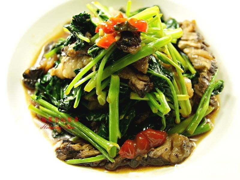 2热锅加入少许的油,先放入梗快炒,再放入叶子部分快炒加入少许白酒拌匀盛出