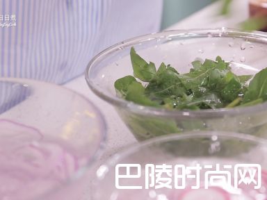 2洋葱切薄丝;樱桃萝卜切薄片;与芝麻叶分别泡冰水备用。