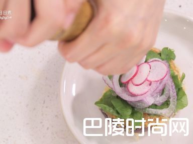 6准备盘子,放入茄子片,把泡水的蔬菜沥干水份,放适量在茄子上,洒上适量海盐及黑胡椒。