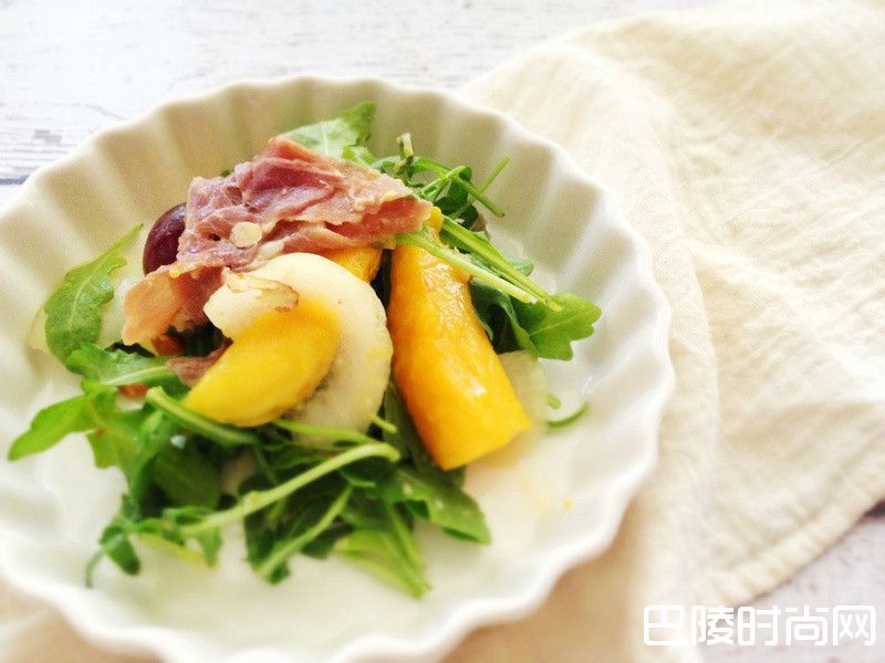 芒果芝麻菜沙拉大芒果 1/2个切条,火腿 1~2片切小片,红色洋葱 1/4个,切丝,松子或杏仁片 3/8杯以平底锅干烤,芝麻菜 2~3杯,柠檬汁 4小匙,红酒醋 2小匙,橄榄油 4小匙,芥末酱 1小匙