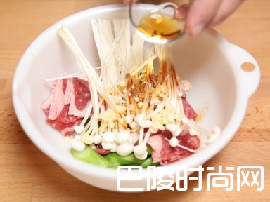 2在碗中将芥兰,肥牛肉,金针菇和调味料混合