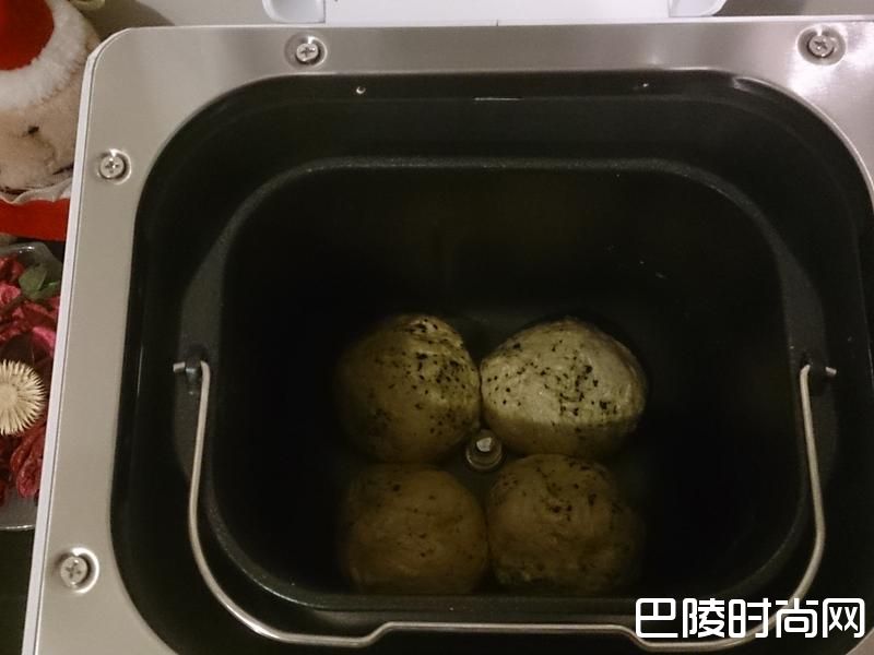 2面包机进入第一次发酵后按暂停,拿出面团与含油香椿面团搓揉后分成四小块放入面包机内,启动按键继续发酵。