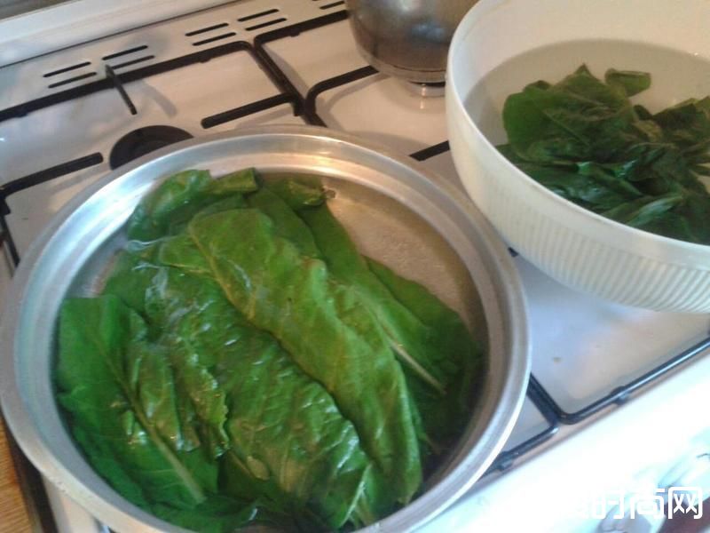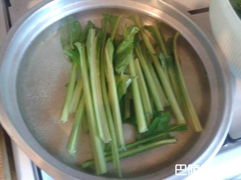3将pazi的叶梗和叶片用手折断,用清水洗净浸泡。然后放入热水中川烫10秒钟翻面再烫10秒即可拿出,放在冷水里漂凉。