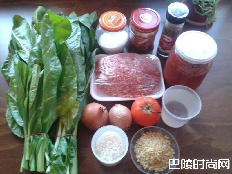 1500gpazi/500g牛绞肉/一个拳头大小的洋葱/一个番茄/ 2/3杯米/ 1/4杯粗麦粒/1杯水/一汤匙红椒酱/盐,黑胡椒粉,辣椒粉适量/奶油30g左右全部拿出来准备好!