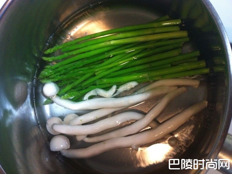 3主食材切段淋上酱汁,美味的黑芝麻酱佐芦笋白精灵菇上桌啦!!